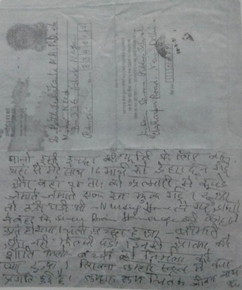 मानो इसी इच्छा की पूर्ति के लिए वह यहाँ से मेरे साथ 16 मार्च को देहरादून गई और वहाँ 24 तारीख को अल्मारी में कपडे जमाते जमाते एकदम झुक गई।छुआ तो ठंढी पडी थी। Nursing home ले गए।डॉ ने कहा कि severe Brain Haemorrhage की वजह से अंत हो गया। चलो अच्छा हुआ-बीमारी और नहीं झेलनी पडी।उनकी आत्मा को शांति मिले। बच्चों और निर्मला को प्यार कहना। लिखना तुम्हारे स्कूल में क्या क्या प्रगति हुई है।